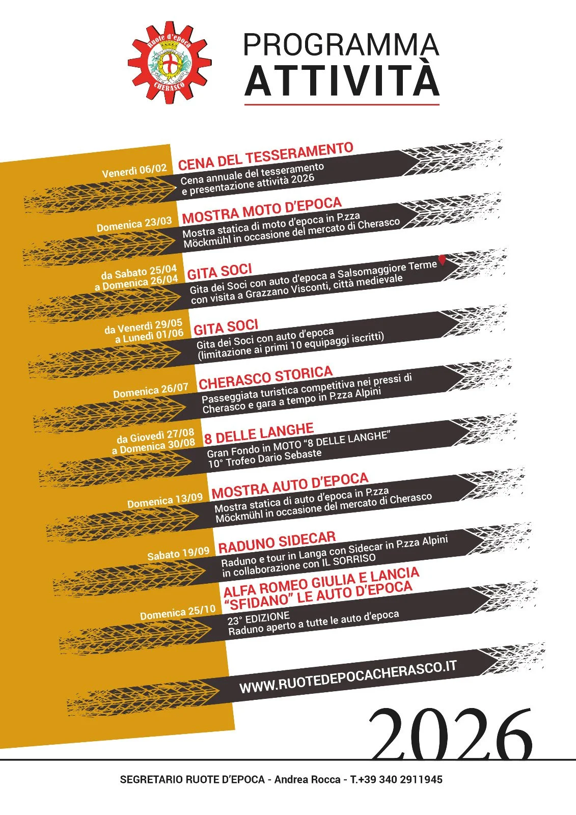 Scopri tutte le attività organizzate dall’associazione Ruote d’Epoca Cherasco e preparati a vivere eventi unici tra motori, storia e passione.